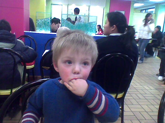 And here we are at the McDonald’s again. I don’t have a photo from Qianmen Dajie construction street, because I was carrying Leo asleep around the theme park wall when we passed the south gate of that construction site which is at least as big as the Forbidden City. Would have been a great picture, with a real camera. But there was a guard, who was just closing the gate. Leo is three years old on Friday, March 14, 2008. He has grown, but he still doesn’t say more than five clearly discernible words in any language, although he understands a lot and tells you very forcefully when he needs something. He needs to run around a lot. Not fussy with food at all though, and very mild in his temper in general, compared with Maia, or his parents. But Maia can play rather quietly with a friend for hours now. She has been doing that in our yard downstairs, with Yang Yang, the daughter of a Chinese neighbour on staircase #2 in our building. Yang Yang goes to the same Kindergarten group as Zhuang Zhuang, Maia and Leo.