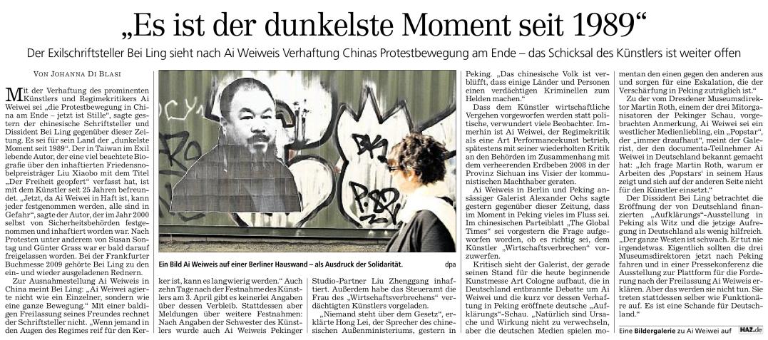 Verhaftungswelle – Ai Weiwei, vorher schon andere Künstler wie Wu Yuren; auch Ran Yunfei und viele andere Blogger, Teng Biao und viele andere Menschenrechtsanwälte …