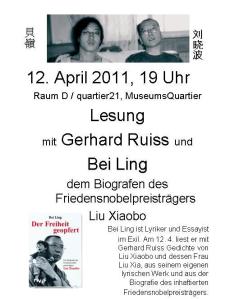 Am 12. April liest Bei Ling mit Gerhard Ruiss Gedichte von Liu Xiaobo und Liu Xia (der Frau des inhaftierten Nobelpreisträgers, die seit Oktober in ihrer Wohnung festgehalten wird). Außerdem trägt Bei Ling aus seinem lyrischen Werk vor und liest aus der Biografie über den Friedensnobelpreisträger.