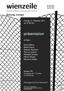 10月 10, 2011Ni hao, hope this finds you well. We are fine, the kids are in school. The new issue of the magazine Wienzeile has come out in Vienna, with a few of my poems. Die Zeitschrift Wienzeile ist gerade erschienen, inkl. einer Doppelseite mit Gedichten von mir. In den letzten Monaten sind Übersetzungen von mir in vielen Zeitungen und Zeitschriften in Hongkong, Deutschland, in der Schweiz und in Österreich erschienen, inkl. FAZ, Die Zeit, Neue Zürcher Zeitung, South China Morning Post, Lichtungen, Dianmo. Am Montag, 17.10 um 13 Uhr war ich im Radio. (39:08-49:08)