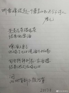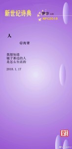 Yi Sha 伊沙 aus Xi’an 西安 stellt seit 2011 jeden Tag ein Gedicht in chinesischen sozialen Medien vor. Jetzt sind es über 900 Autorinnen und Autoren mit über 2500 Gedichten. Die Initiative heißt auf Chinesisch 新世纪诗典, auf Englisch New Century Poetry Canon, abgekürzt NPC. “NPC” wird sonst für National People’s Congress verwendet, den Nationalen Volkskongress, die parlamentarische Versammlung in Peking, die jeden März zusammentritt. Yi Sha streicht die Abkürzung hervor, weil er stolz ist auf diese breite und dadurch relativ demokratische Versammlung der Poesie aus allen Teilen des Landes. Und das völlig abseits der offiziellen Strukturen wie Schriftstellerverband etc. Berühmte Namen sind vertreten, aber vor allem ist es eine Plattform für vielartige und immer wieder erstaunliche Entdeckungen. Viele dieser Texte werden schon am ersten Tag 10.000 Mal oder noch öfter angeklickt. Später werden sie in Büchern gesammelt, sieben Bände sind schon erschienen. NPC ist mit zahlreichen Aktivitäten in ganz China und darüber hinaus verbunden. Im Herbst erscheint bei fabrik.transit in Wien eine zweisprachige NPC-Anthologie. Am 24. Mai 2018 werden im Literaturhaus Wien bei der Präsentation des China-Schwerpunkts der Zeitschrift Podium AutorInnen vorgestellt, die in der Anthologie vertreten sind.