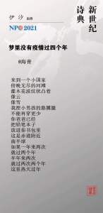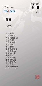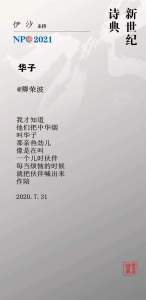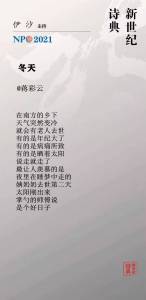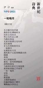 NPC steht für New Poetry Canon, eigentlich New Century Poetry Canon, 新世纪诗典. Abgekürzt als NPC. NPC steht sonst für National People’s Congress, also der Nationale Volkskongress, Chinas Parlament, das allerdings nur einmal im Jahr im März zwei Wochen lang zusammentritt. Seit 2011 wird von Yi Sha 伊沙 im NPC-新世纪诗典 jeden Tag ein Gedicht vorgestellt, in mehreren chinesischen sozialen Medien zugleich. Oft wird ein einziges Gedicht schon in den ersten zwei Tagen zehntausende Male angeklickt, kommentiert und weitergeleitet. Ein nationaler Poesiekongress und eine umfangreiche Studie der heutigen Gesellschaft. Band 1 präsentiert 81 Autorinnen und Autoren. Wird fortgesetzt.