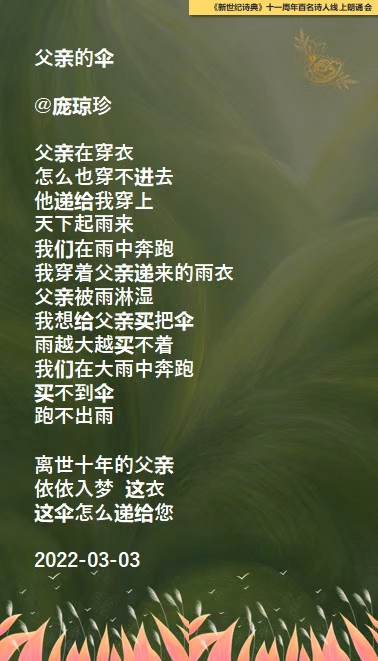 VATERS SCHIRM – 庞琼珍 Pang Qiongzhen