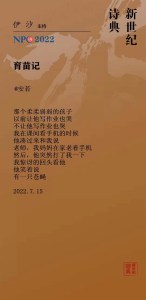 发表在 1930s, 1940s, 1950s, 1960s, 1970s, 1980s, 1989, 1990s, 2000s, 2010s, 2020s, 2021, 2022, 20th century, 21st century, August 2022, Middle Ages, NPC, poetry, Song Dynasty, Translations, Yi Sha, 新世纪诗典, 伊沙 | Leave a Comment »