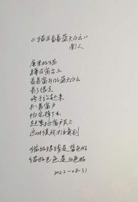 KATZE SCHAUT IN DEN BLAUEN HIMMEL MIT WEISSEN WOLKEN – 南人 Nan Ren