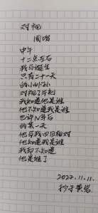 伊沙推荐:半月冠亚军产生的标准比较灵活:有感觉突出者、有观念先进者、有意识先锋者……这些都没有,那就看谁写得好一一写作上的完成度完善度高,11月上半月冠亚军便是这样产生的,张敬成这一首当获冠军,这是一位平均单首水平较高的诗人。