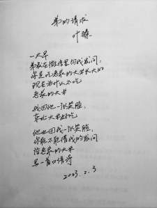 伊沙推荐:曾记否,诗外诗内那些忧天的杞人们:在诗外,有人担心中国的下一代爱过洋节不爱过传统节日了;在诗内,有人担心中国现代诗全盘西化无视民族文化传统了,现如今,忧天者大多成灰,被忧者也老了,还是正常的中国人,而中国现代诗已经长大成熟一一全盘西化者不可能长大成熟,因其没有身体、血肉和灵魂。现如今,传统的东西反而依赖现代诗写活写真写生动,本诗正是如此。