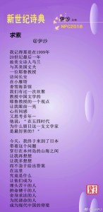 10 years ago, Yi Sha 伊沙 began to present one poem each day on Chinese social media. This has become a representative collection of new poetry in the new century, aptly named NPC, New Poetry Canon 新世纪诗典.