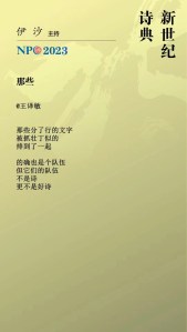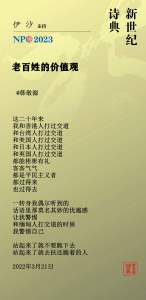 发表在 18th century, 1900s, 1910s, 1920s, 1930s, 1940s, 1950s, 1960s, 1970s, 1980s, 1990s, 2000s, 2004, 2020s, 20th century, 21st century, Antique times, Byzantinian times, February 2023, Middle Ages, NPC, poetry, Qing Dynasty, Translations, 新世纪诗典 | Leave a Comment »
