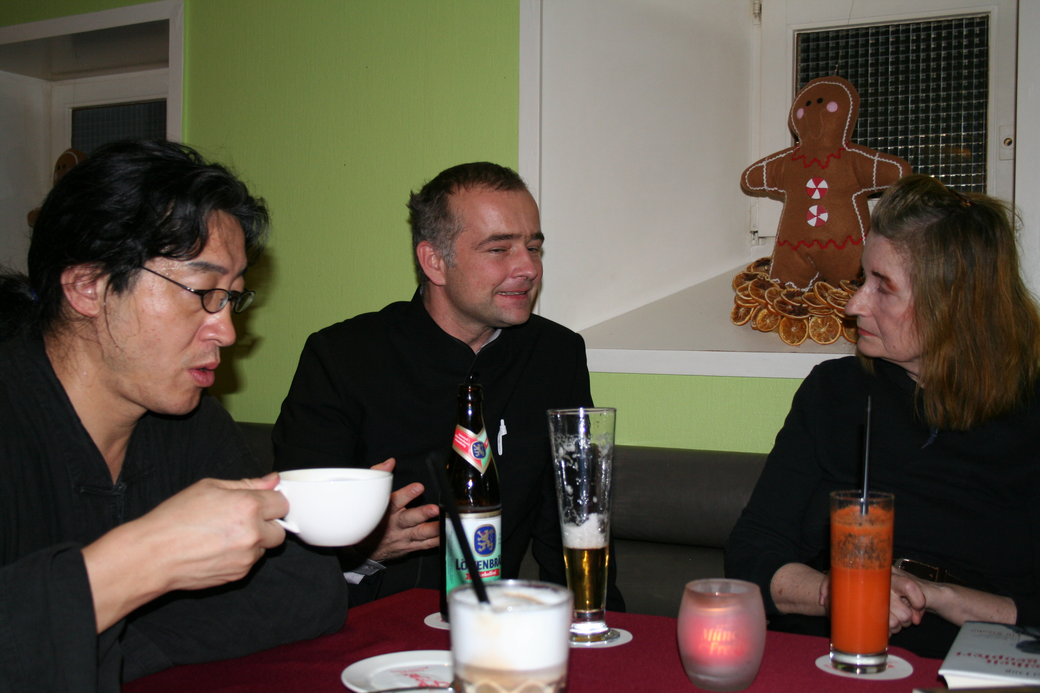 2010年12月8日,葉尼涅克(Elfriede Jelinek)與貝嶺和翻譯馬丁(Martin Winter)在慕尼黑就文學、作家與其組織、中國和奧地利,以及劉曉波和獨立中文筆會展開一場對談。除此之外,我們討論關於各國的獨立筆會──奧地利也是其一,因為自從1970年代開始,奧地利的出版物已因冷戰受限在少數的掌權者。今年春季,葉尼涅克曾在廣播中聽過廖亦武的詩。她對中國文學感興趣已有一段時間。以下是一些照片: