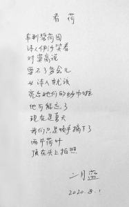 伊沙推荐:做人可以多一事不如少一事,事不关己高高挂起,做文学批评家不可以,好的批评家一定是多事儿、揽事儿、找事儿,我看见就必须说出-我自诩为后者,想说出一个现象:口语诗人在《新诗典》里泡几年,其势似乎很容易变厚,抒情或意象或口语化诗人则比较难,二月蓝似乎是后一种,也许这里不是后一种诗人发展壮大自己最好的环境-可最好的环境又在何处呢?所以,与典俱进,并不是发几首诗那么简单,典外还须下大功夫真功夫。