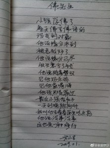 Gutes hat gute Folgen, Böses böse. Shan you shan bao, e you e bao. Das “e” hier ist ein kurzes, entschiedenes Schwa, eher wie ein ö als wie ein deutsches “e”. Bitte versucht einmal, das ganze Sprichwort laut auszusprechen. Y = deutsches j, ou = ou. Sh wie auf Englisch. Shan you shanbao, e you ebao. Bu shi bu bao, shi hou wei dao! Bu bedeutet hier nein, nicht. Bu shi = ist nicht, das ist nicht so. Nicht, dass es kein Karma gibt, nur die Zeit ist noch nicht da. Shi-hou heißt Zeit. Wei heißt noch nicht. Ei wie bei Beijing (Peking), also kein deutsches “ei”. Ai Weiwei heißt wörtlich Ai Nochnicht Nochnicht. Ai Zukunft Zukunft. Ai ist der Familienname. Siehe auch die Wikipedia-Einträge zu Ai Qing und zu seinem Sohn Ai Weiwei. Aber zurück zu meinem Gedicht. Bu shi bu bao, shi hou wei dao. 不是不报,时候未到。Diese beiden Zeilen sind genau gleich wie in dem alten buddhistischen Sprichwort. Und auch in den Zeilen davor habe ich nur “gut” (shan 善) mit “früh“ (zao 早 frühmorgens etc.) ersetzt und ”böse” (e 恶) mit “spät” (wan 晚, spät und abends) ersetzt. Schaut bitte noch einmal hin. Das meiste ist gleich, nicht wahr? Deshalb ist mein Gedicht unübersetzbar. Es wirkt nur, wenn man das Sprichwort schon kennt. Jede und jeder kennt es in China, Taiwan etc. Aber was haben Morgen- und Abendzeitungen mit Karma zu tun? Nicht, dass da kein Karma kommt, nur die Zeit ist noch nicht da. Nicht, dass nicht berichtet wird, nur die Zeit ist noch nicht reif. Diese beiden Sätze sind auf Chinesisch dasselbe.