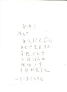 先写了中文,还有德语版。英语以后写的,也许第二天。这首在中国不能发表,网上能看到已经不错。这两年贴了几次,没有人说诗里的批评有什么不对。就是不能发表。同时候写了另一首可以发表的: