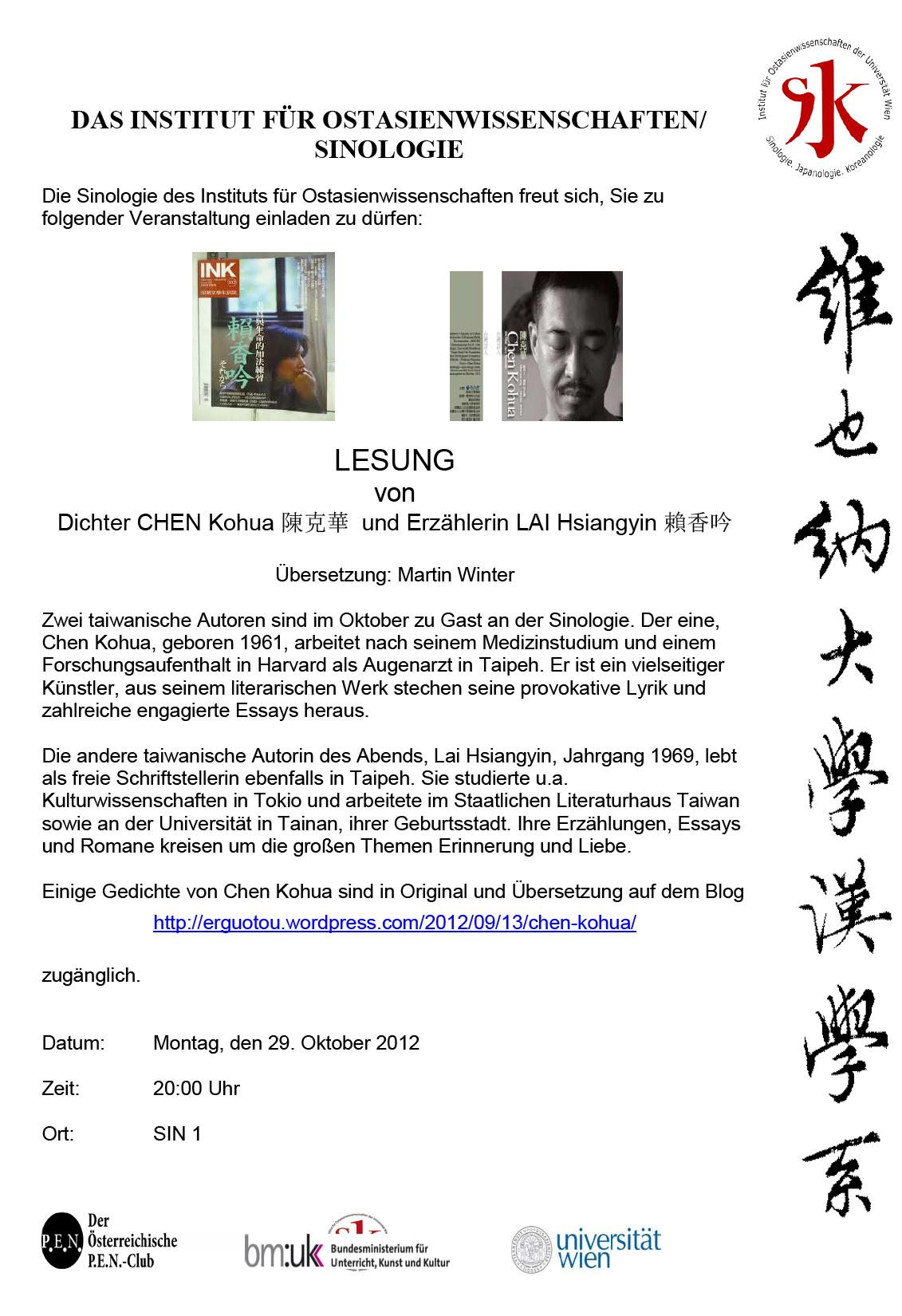 Chen Kohua und Lai Hsiangyin sind im Oktober zu Gast im Literarischen Colloquium Berlin. Außerdem werden sie an der Universität Heidelberg aus ihren Werken lesen.