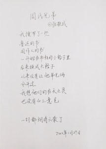 In English I can talk about writing in any language, also English, while being away from the environment. I wrote this poem in Chinese in response to what happened last year and this year at a certain place in China. But the absurd aggression, the senseless destruction and ruin could also be Trump and Musk’s ‘work’, right? Or Putin and so on.