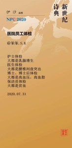 5、读完全诗,再结合作者的职业,更像是一幅自画像,而事实上,通过对医务人的呈现和对话,显现出其工作的不易,以及职业的“病体”,既让人忍俊不禁,又叫人突感悲凉;