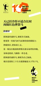 磨铁诗歌奖·2023年度最佳诗歌100首|路雅婷《天已经冷得不适合长时间骑红色弹簧马》入选理由:路雅婷一直在致力于,用一种新的语言重新描述日常生活,或者说,是让日常生活在一种新的语言中,重发焕发出你仿佛重未见过的光彩。她在构建一种语言和事物的关系。很多时候,事物已经被语言说旧了,不是事物旧,事物永远不会陈旧,是覆盖于事物上的语言令事物变得了无新意,庸常琐屑,不值一提。不能令事物焕发出新鲜样貌的语言都是陈词滥调。而路雅婷,在这首诗中,用她的语言,将骑旋转木马这件事,重新写出了陌生感,新鲜感,内在甚至还传递出了情感。我还想提醒读者注意的是,在重塑事物的过程中,路雅婷使用的是一种非修辞语言,这很厉害,确实构成了一种新的语言。(磨铁读诗会/沈浩波)